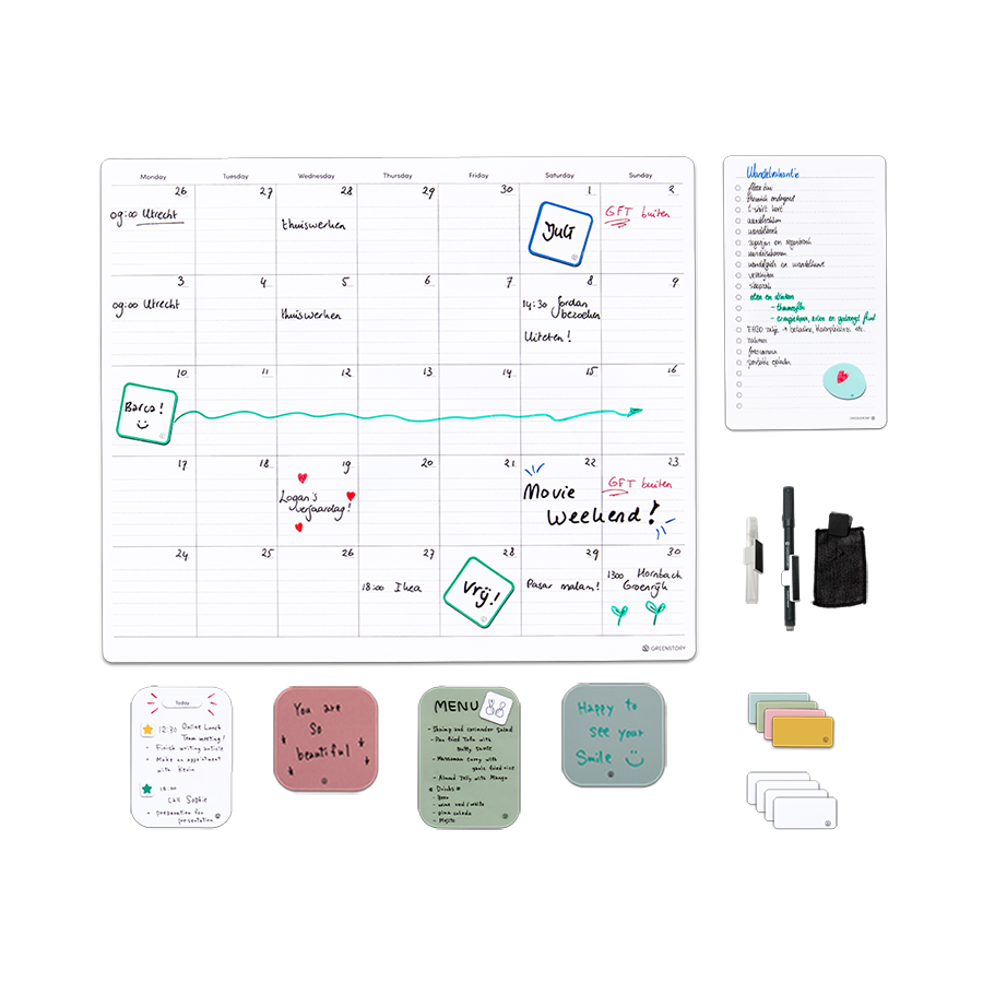 GreenStory’s sticky whiteboards zijn een handig en veelzijdig gereedschap voor moderne huishoudens. Deze herbruikbare whiteboards kunnen eenvoudig op verschillende oppervlakken worden geplakt, zodat je op verschillende plekken van het huis whiteboard oppervlak kunt creëren. Dankzij hun duurzame ontwerp dragen de sticky whiteboards bij aan een milieuvriendelijkere levensstijl. Ze kunnen herhaaldelijk gebruikt worden en papiervervuiling voorkomen.